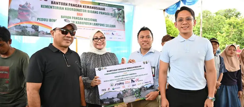 Bantuan diserahkan secara simbolis oleh Asisten Deputi Cadangan Pangan dan Bantuan Pangan Kementerian Koordinator Bidang Pangan RI, Sugeng Harmono, S.Hut., M.Si., bersama Bupati Lampung Selatan terpilih, Radityo Egi Pratama, kepada korban terdampak bencana di Kantor Desa Sinar Pasemah, Kecamatan Candipuro, pada Minggu (26/1/2024).