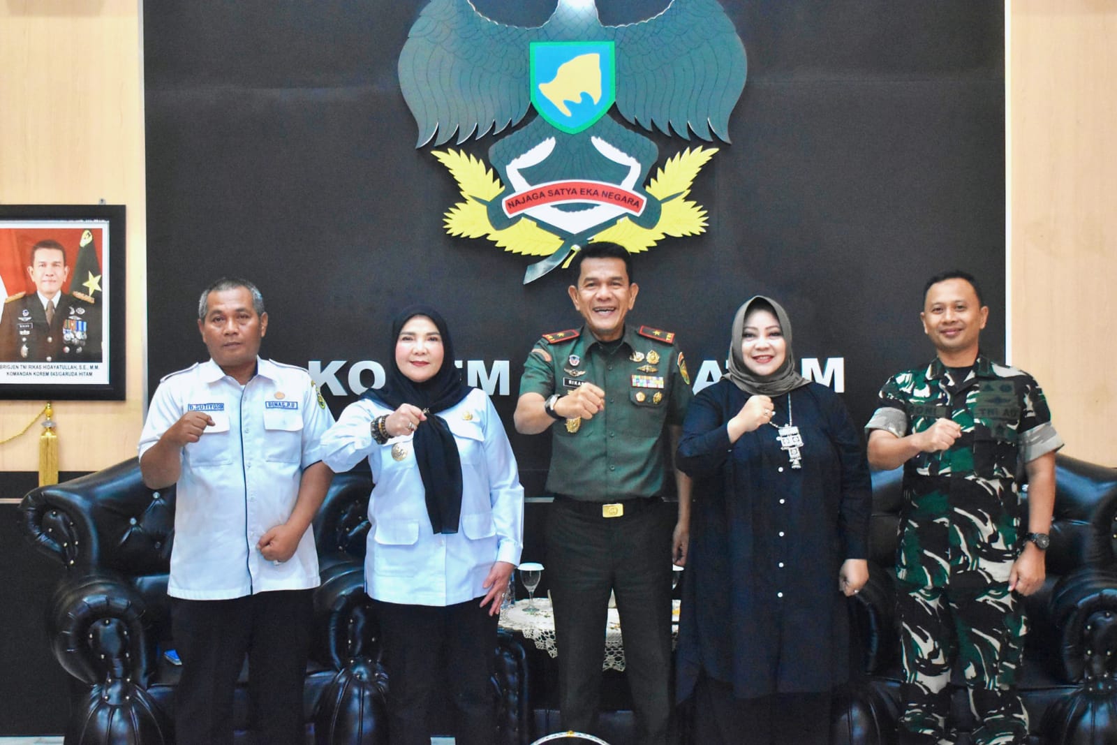 Lampung – Komandan Korem 043/Gatam Brigjen TNI Rikas Hidayatullah, S.E., M.M., didampingi Dandim 0410/KBL Letkol Arm Roni Hermawan, Ketua Persit Kartika Chandra Kirana Koorcab Rem 043 PD II/Sriwijaya Ibu Hanny Rikas Hidayutullah, menyambut kunjungan kerja Wali Kota Bandar Lampung Hj. Eva Dwiana. Kegiatan berlangsung di Ruang Lobi Utama Makorem 043/Gatam, Jalan Teuku Umar, Penengahan, Bandar Lampung.