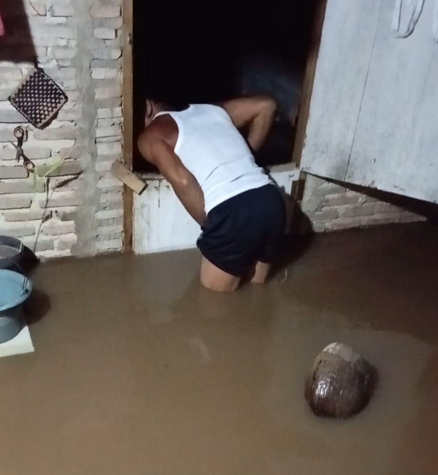 “Saya sudah mengira bakal terjadi banjir! Karena memang daerah sini memang langganan banjir, makanya pas hujan turun saya dengan istri bergegas mengangkut perabot untuk diamankan agar tidak terkena banjir. Tapi untuk perabot dapur tidak bisa diselamatkan, mengingat derasnya hujan yang mengakibatkan kenaikan air lebih cepat,” ujarnya.