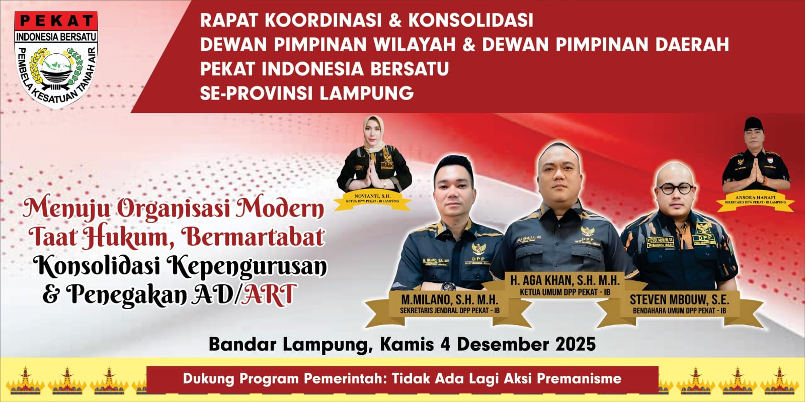 Dalam forum tersebut, DPW Lampung kembali menegaskan status hukum organisasi. PEKAT Indonesia Bersatu sebagai induk organisasi memiliki legalitas yang sah berdasarkan SK Kemenkumham Nomor AHU-0001179.AH.01.08.TAHUN 2023. Sementara kepengurusan DPW Lampung yang dipimpin Novianti mengacu pada SK DPP Nomor Kpts.023/DPP-PEKAT IB/I/2025.
