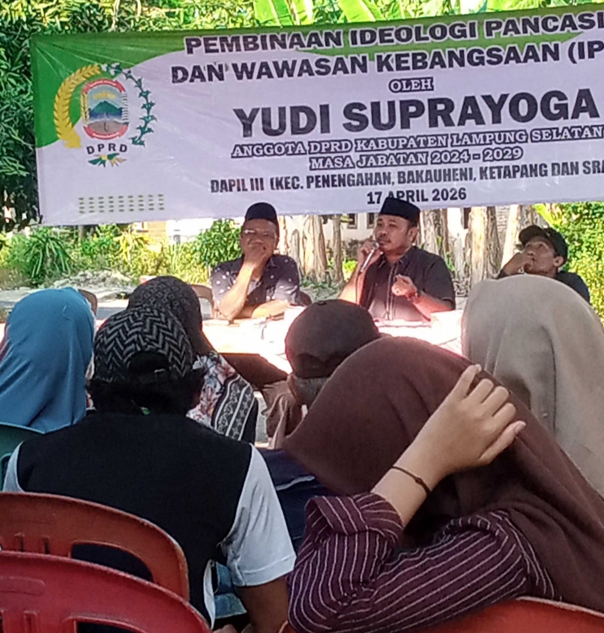 Lampung Selatan – Anggota DPRD Kabupaten Lampung Selatan, Yudi Suprayoga, melaksanakan kegiatan Pembinaan Ideologi Pancasila dan Wawasan Kebangsaan (IPWK) di Desa Ruguk, Kecamatan Ketapang, Jumat (17/4/2026).