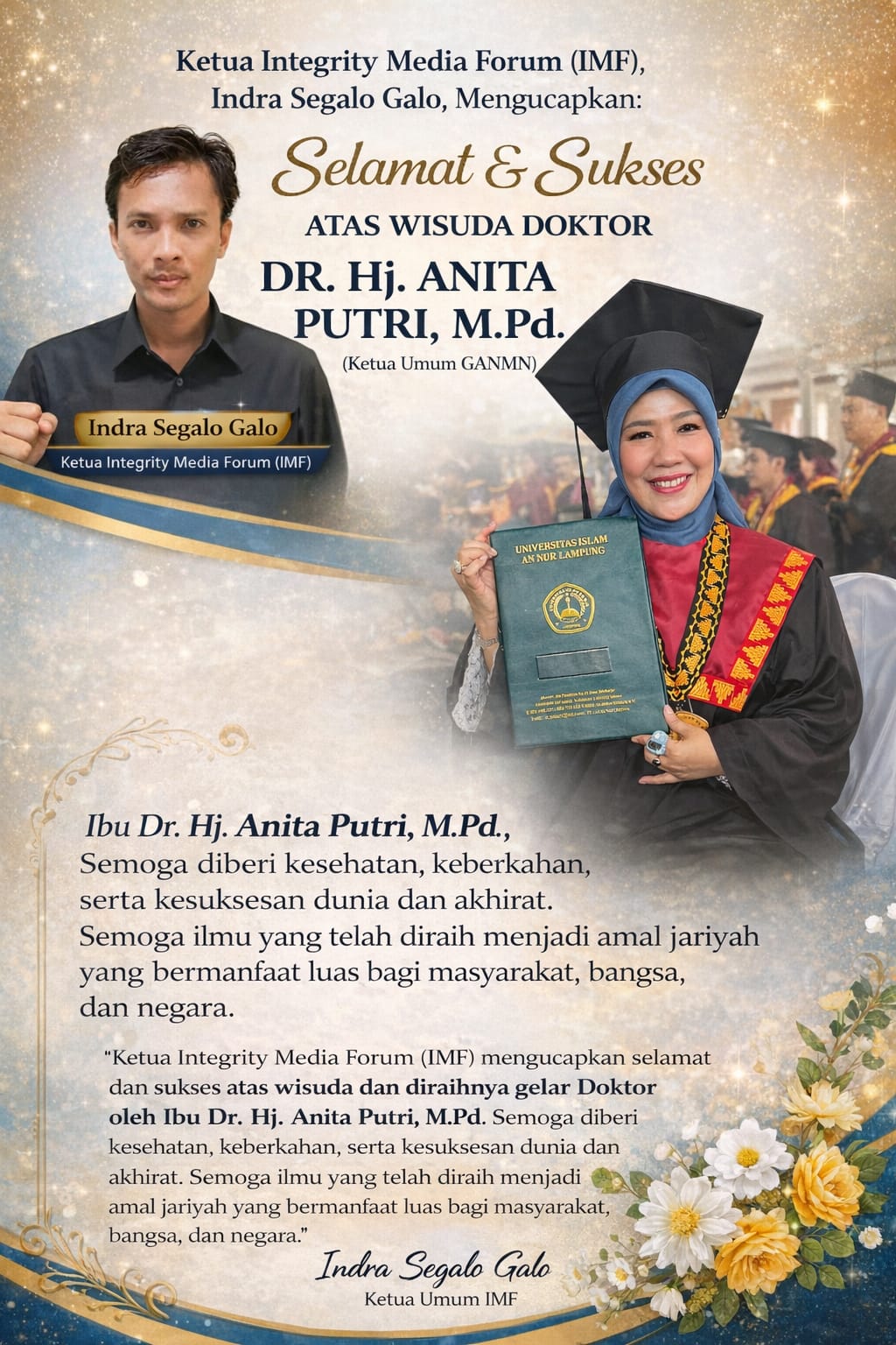 “Kami keluarga besar Integrity Media Forum (IMF) mengucapkan selamat dan sukses atas wisuda dan diraihnya gelar Doktor oleh Ibu Dr. Hj. Anita Putri, M.Pd. Semoga senantiasa diberikan kesehatan, keberkahan, serta kesuksesan dunia dan akhirat,” ujar Indra, 14 Februari 2026.