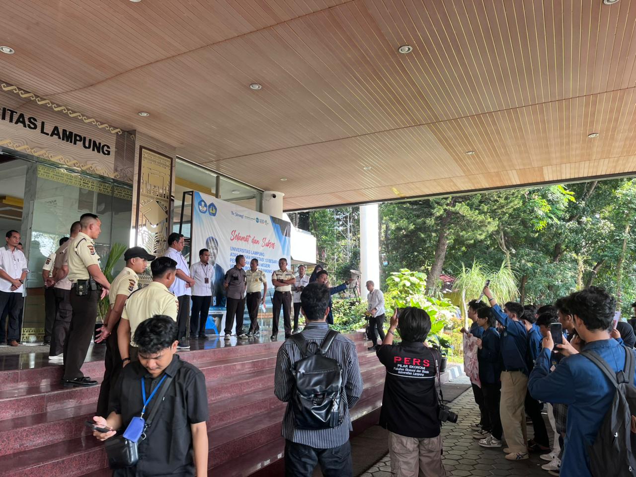 Para mahasiswa yang berjumlah ratusan orang tersebut, menggelar unras di depan gedung Rektorat Unila minta tanggungjawab ke Dekan FEB Unila Atas Meninggalnya Pratama Wijaya.