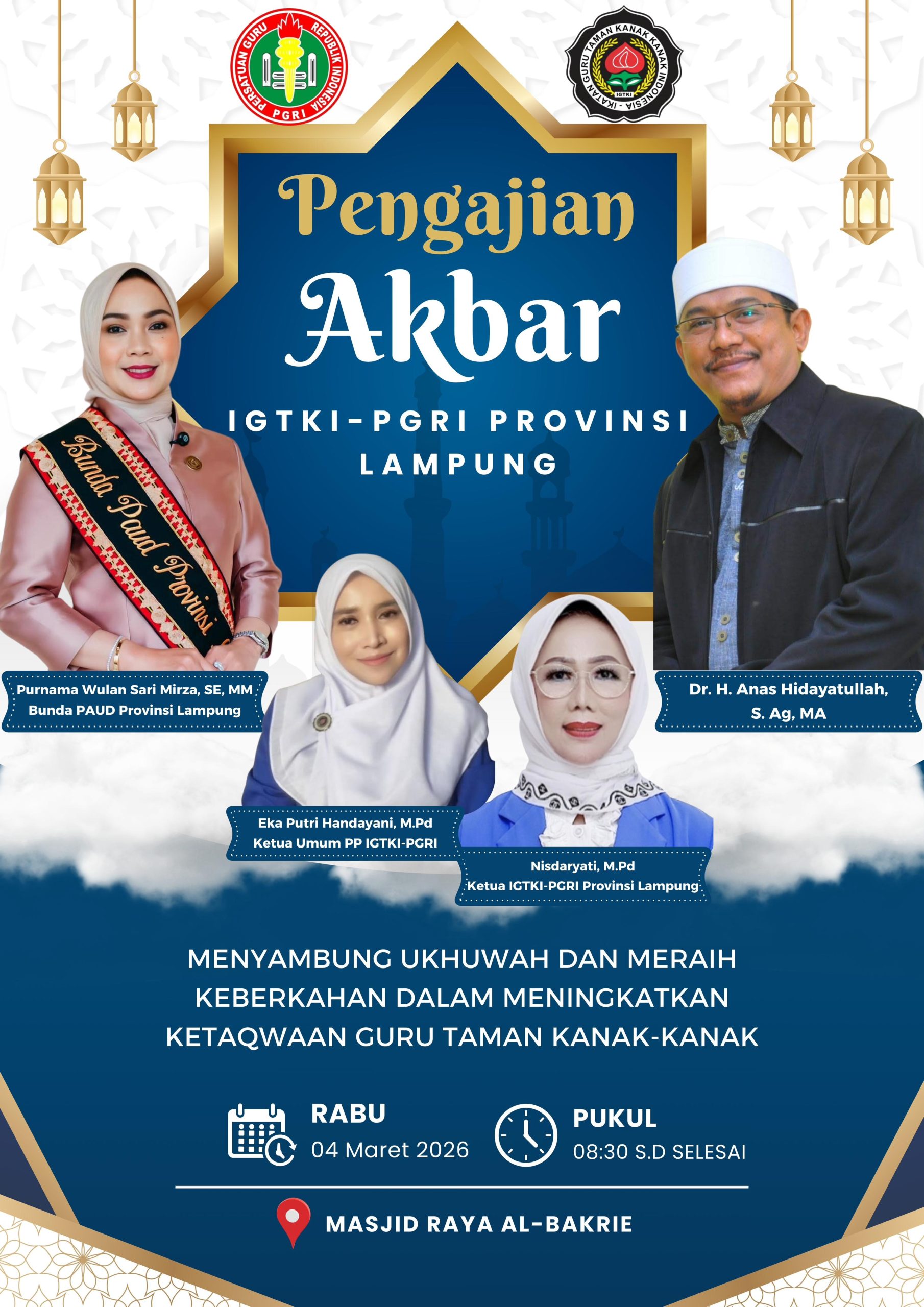 Bandar Lampung – IGTKI-PGRI Provinsi Lampung akan menggelar Pengajian Akbar pada Selasa, 4 Maret 2026, sebagai bagian dari penguatan pembinaan rohani dan silaturahmi guru Taman Kanak-Kanak se-Provinsi Lampung.