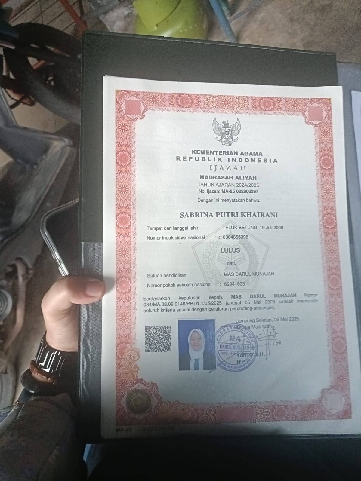 Lampung Selatan – Bersama Kepala Kecamatan Jati Agung, Rizwan Efendi S.K.M, M.M, Plt. Ketua Dunia Ekonomi Kreatif Muda Indonesia (DEKRAFMI) Provinsi Lampung, Sariyanti, bantu pengambilan Ijazah Sabrina Putri Khairani yang merupakan siswi Madrasah Aliah MAS Darul Munajah yang berada di Kecamatan Jati Agung, Jum’at (5/9/2025).