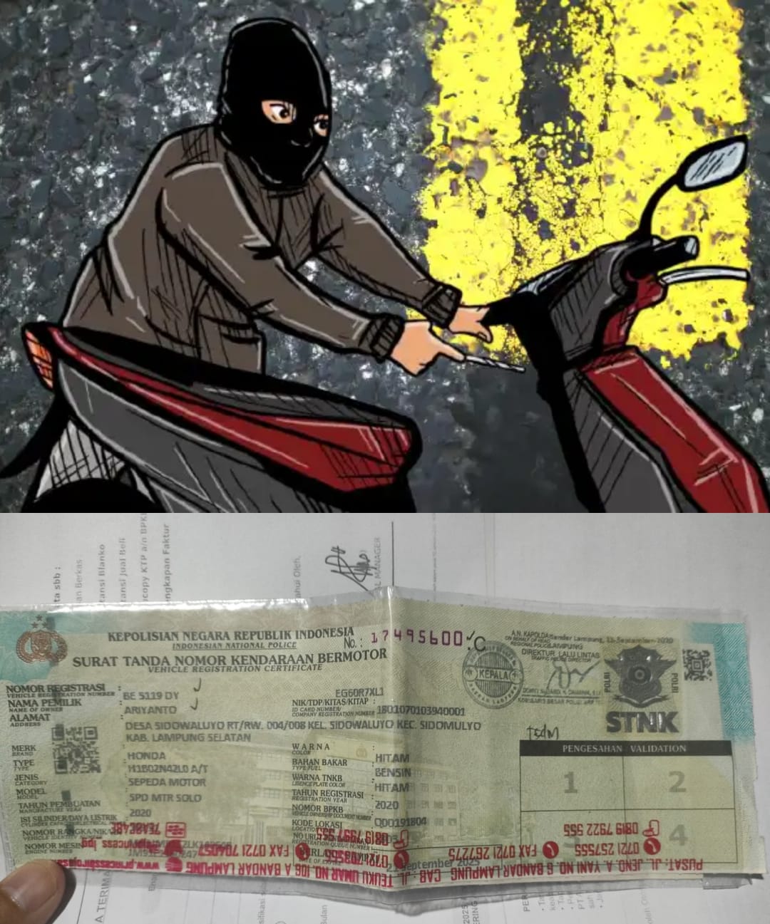 Sidomulyo, Lampung Selatan – Aksi Pencurian Kendaraan Bermotor (Curanmor) kembali marak terjadi di wilayah hukum Kecamatan Sidomulyo, Kabupaten Lampung Selatan. Kali ini, pelaku diduga berjumlah dua orang dan berhasil menggondol satu unit motor jenis Honda Beat warna hitam bernopol BE 5119 DY.
